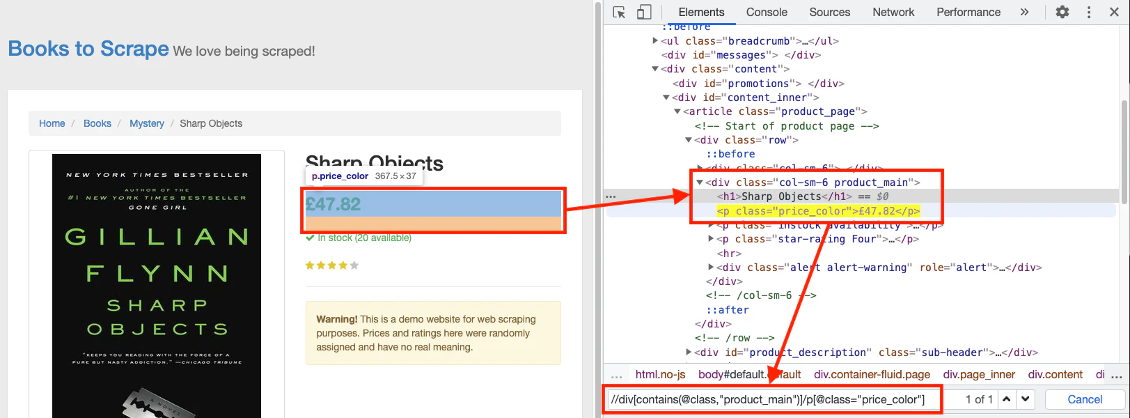 . Creating an XPath for the price is a little trickier because the additional books at the bottom have the same class applied.