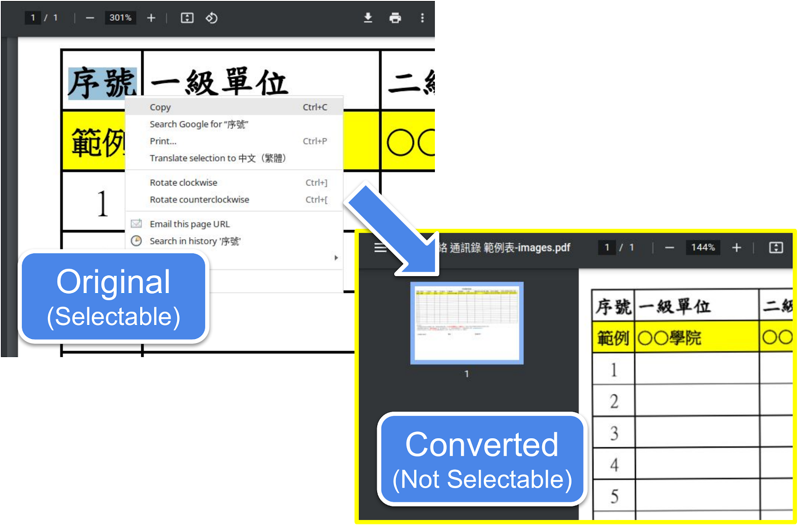 這一個Docker APP的用途是將電子文件模擬成列印後再掃描成PDF的結果。做法是將任意文件轉換成圖片檔,然後稍微轉個角度,再將它組合成PDF檔案。轉換後的PDF不能選取文字,也刻意地呈現有點粗糙的感覺。