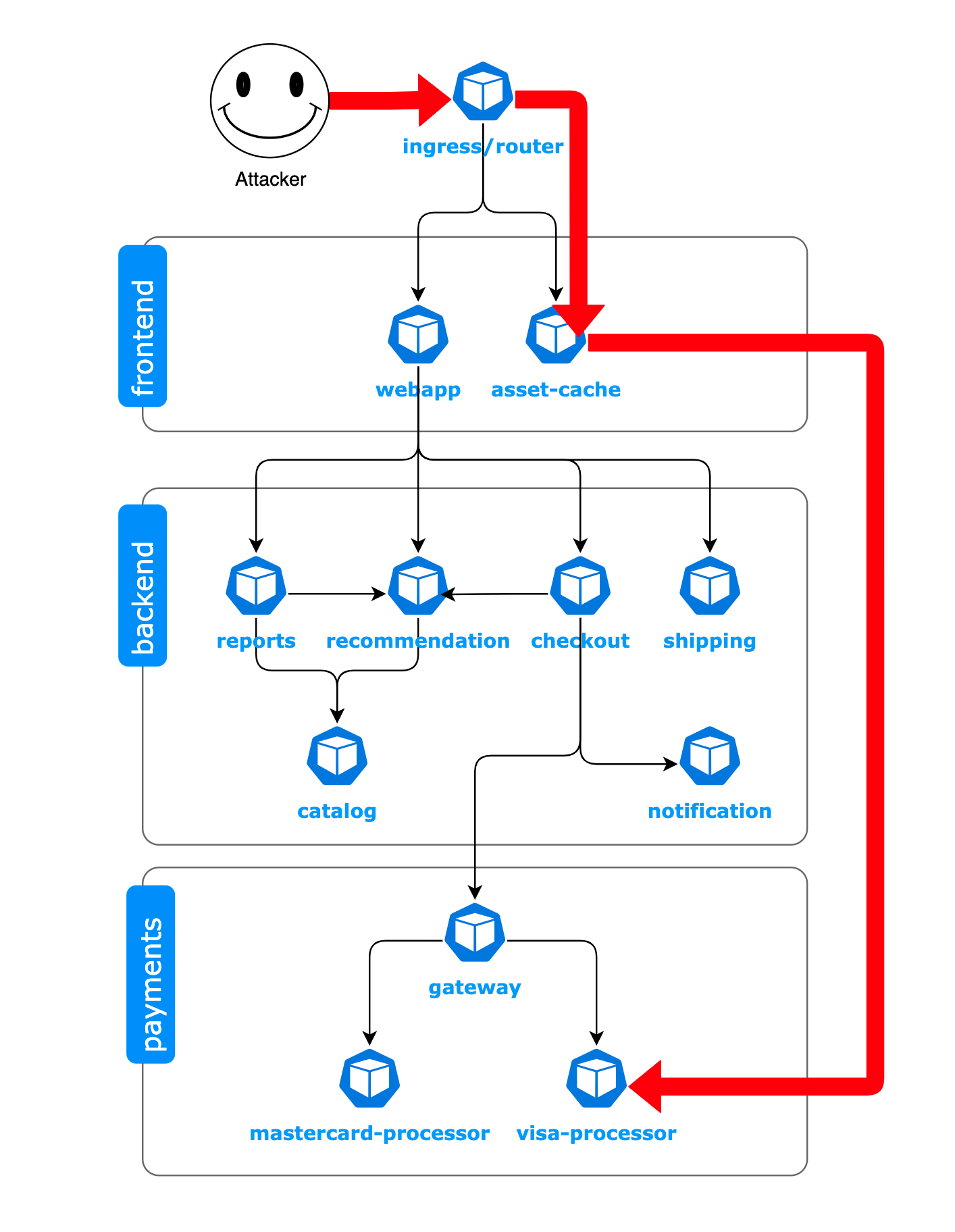 In this scenario, the attacker starts by gaining access to "asset-cache," which may have a vulnerability that the attacker can exploit to gain control of the container. Once the attacker has control of "asset-cache," they then use it as a jumping-off point to try and gain access to "visa-processor."