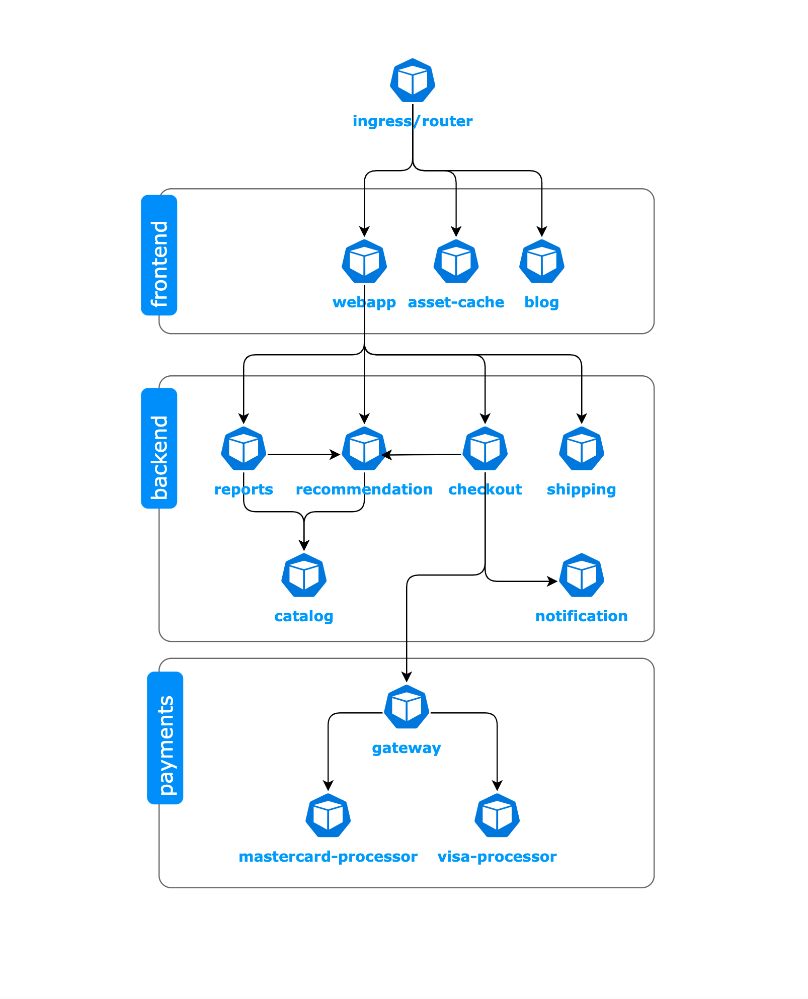 The plan is to use the "asset-cache" as a stepping stone to access a workload called "visa-processor" that is running in the "payments" namespace. There is no network segmentation within the cluster, which means that once they gain access to one part of the system, it will be relatively easy for them to move laterally and access other parts of the system.