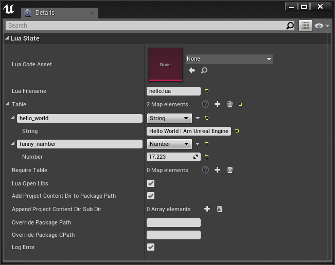 Open the QuickLuaState Blueprint you created before. This Blueprint exposes lot of different fields to configure your Lua Virtual Machine: