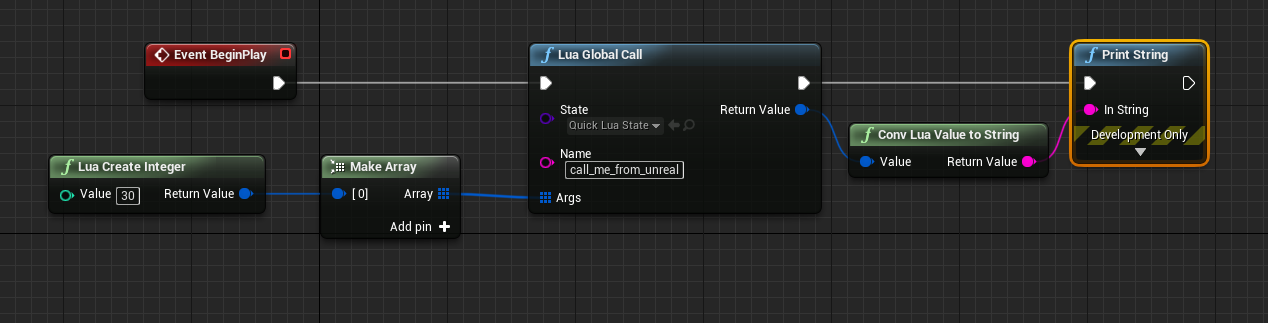 The LuaRunFile node will execute a lua file (relative to the Content/ directory) in the specified LuaState (QuickLuaState in our case) and will return the value returned by the script itself as a LuaValue UStruct. The plugin offers a bunch of operations you can apply to LuaValue's, in this example we simply converted the value to an Unreal String.