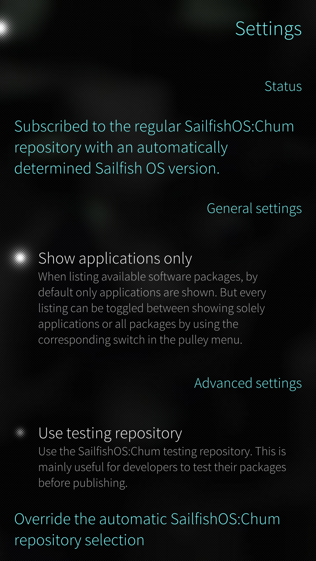 - The ability to overrride the automatic SailfishOS:Chum repository selection based on the installed Sailfish OS release