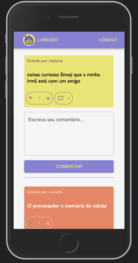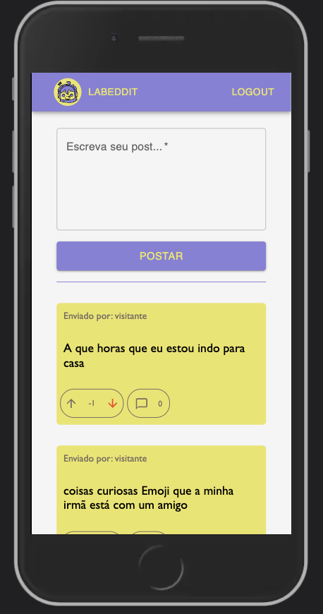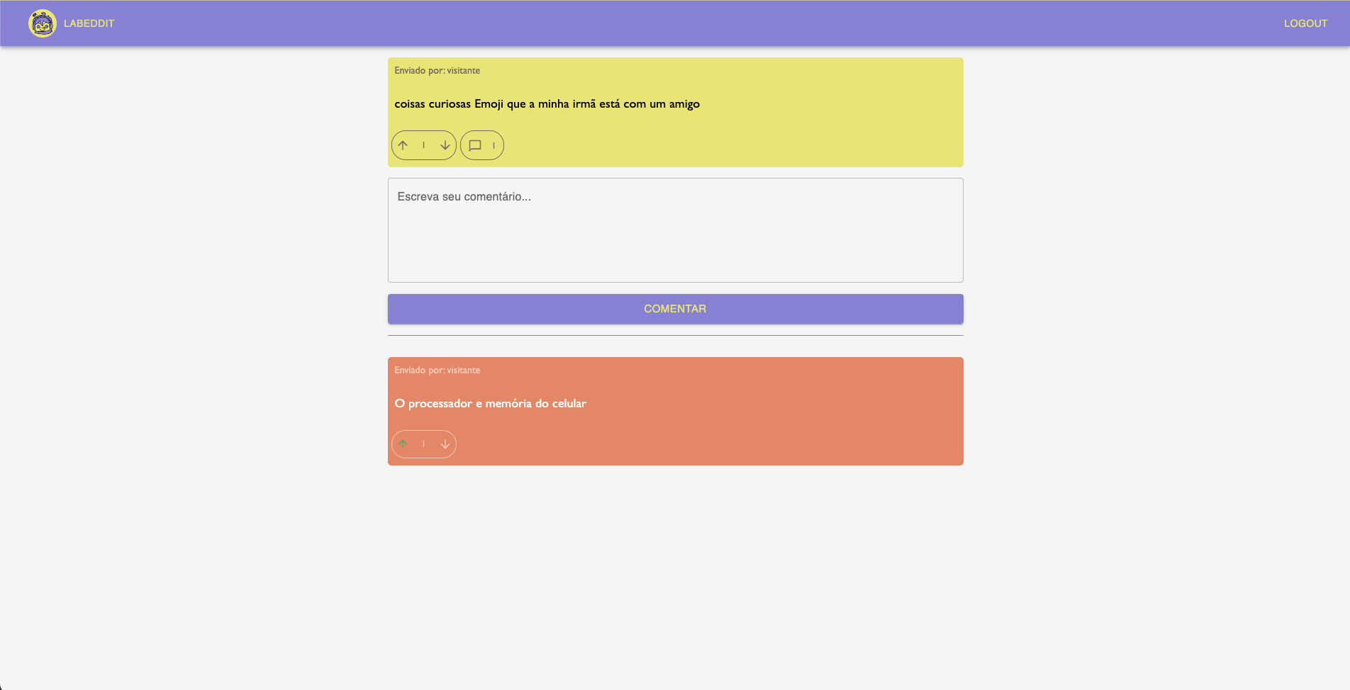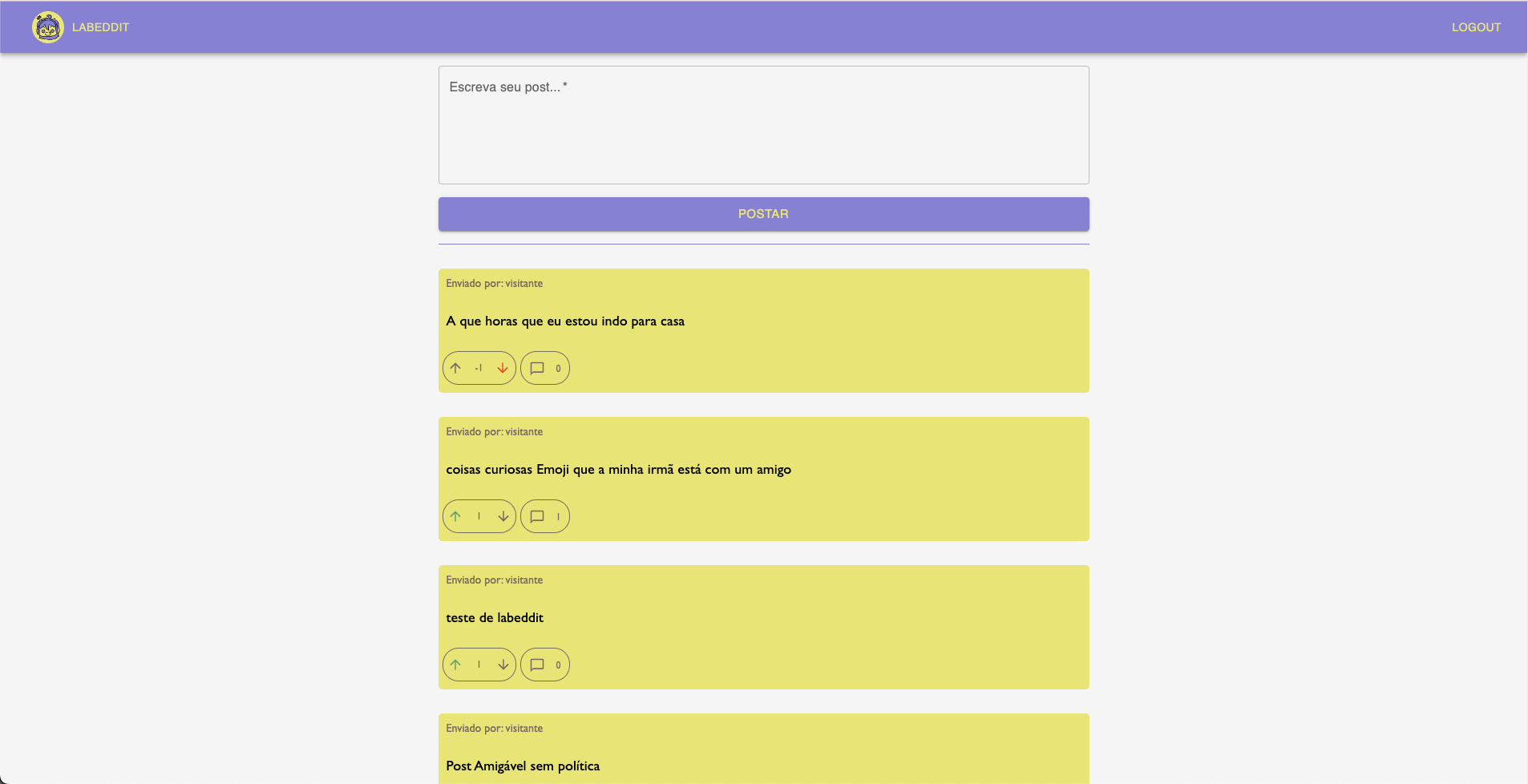 Este projeto foi desenvolvido com base no curso Web Full Stack Integral da Labenu. Esta aplicação consiste em uma plataforma inspirada no Reddit, sendo possível fazer posts, comentar e engajar. O projeto possui área de login, cadastro, área de escrever/enviar o post com a lista dos últimos e mais engajados posts e uma área para maiores detalhes do post serem vistos e também comentados.