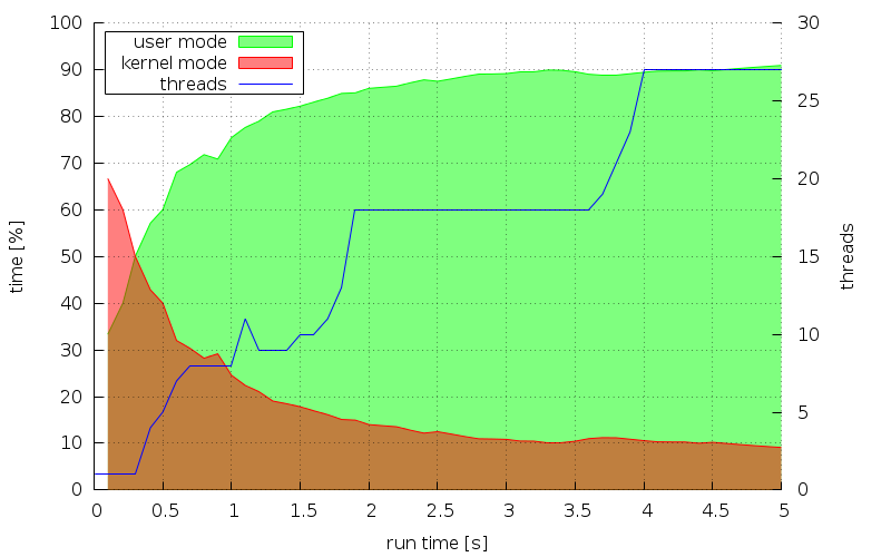 In the last plot we can see the relative time the process spend in user and kernel mode, as well as the current number of threads: