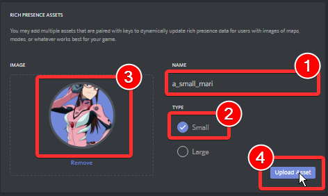 - Upload the images that you will use in your Rich Presence, remember that all the images must have a recognizable name and then identify it in the configuration files of DiscordCustomRP, look carefully at which section you upload the images, if they are "Large" or "Small". In the screenshot we will upload a small image called