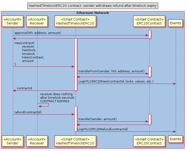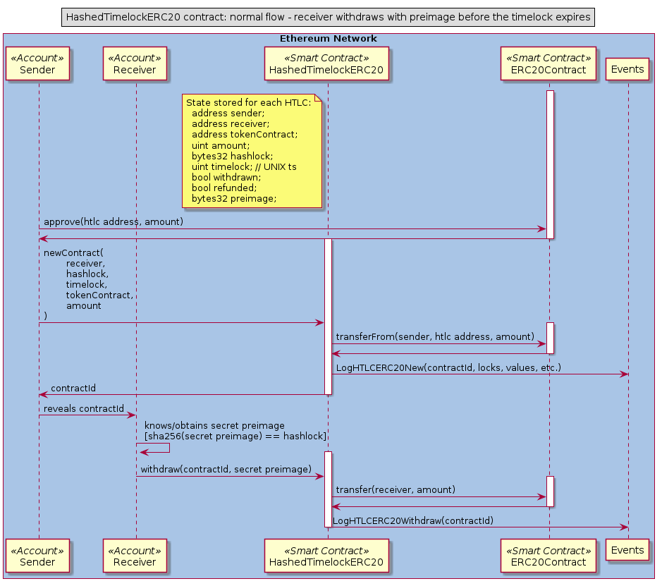 create new HTLC with given receiver, hashlock, expiry, ERC20 token contract address and amount of tokenswithdraw(contractId, preimage)