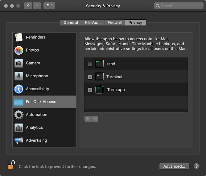 To avoid errors and permission problems, Terminal/iTerm needs Full Disk Access.