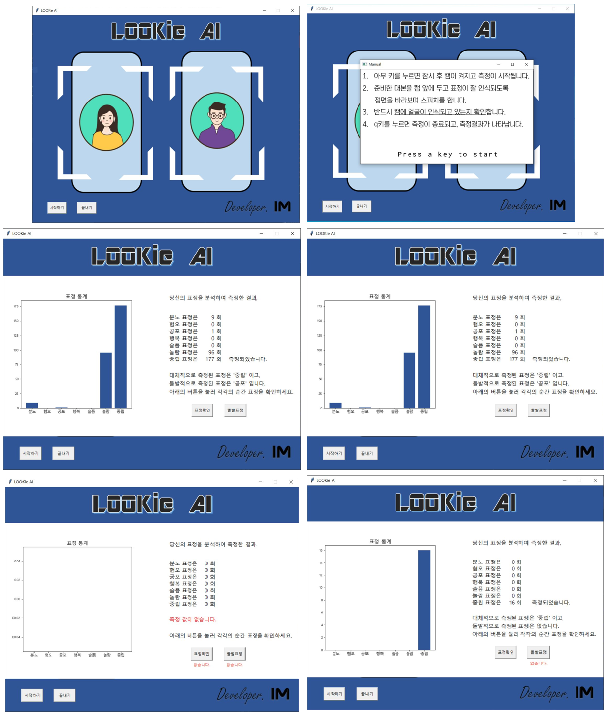 좋은 첫인상을 위한 표정 코치 인공지능 (LOOKie_AI) - 팀 IM Description 부산정보산업진흥원 파이썬 기반 인공지능(SLP) 교육 2021.01.25 ~ 2021.02.23 Summary 사람이 전체적으로 풍기는 분위기는 상대방이 자신의 이미지를 결정하는데 중요한 포인트 표정을 캠으로 촬영하여 7가지의 표정을 통계 대체적으로 측정된 표정과, 돌발적으로 측정된 표정 확인 About Project External resource information https://github.com/omar178/Emotion-recognition https://m.blog.naver.com/roboholic84/221633210887