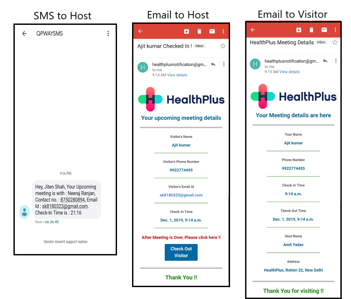 - As the Check-In button is clicked, an Email with all deatils of visitor and a Check-out button for that visitor is sent to Host. A SMS is also sent to Host about Visitor's details. Status of the Host is changed to BUSY on the dashboard.