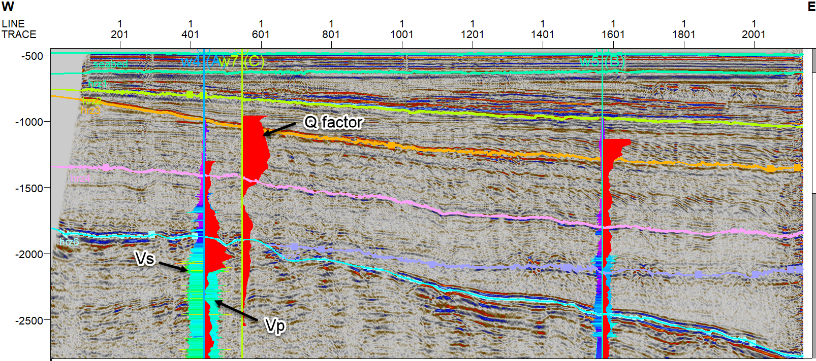 The result (wells converted to time domain using VSP data, without doing Well-Tie: thus wells were transformed to time domain unreliably):
