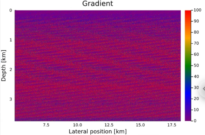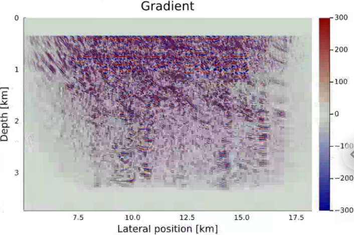 @mloubout It seems I do something incorrect. If you have ideas... The gradient at any iteration looks like in picture below: Calculating single shot at position 5712m with 119 receivers [2500, 5450] gives the following image with the same velocity model and same 16 Hrz Ricker source wavelet: Also at each iteration I set gradient in water to 0: water_depth = Int(350) # meters