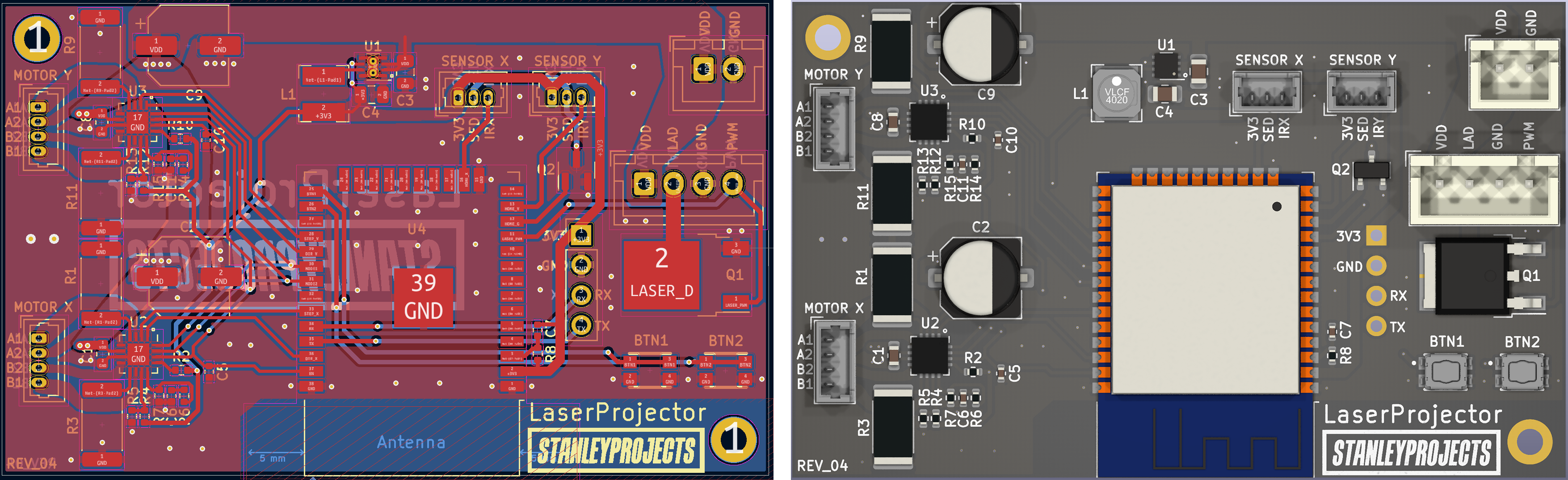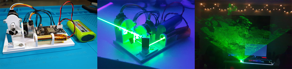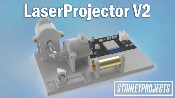 LaserProjector V2 is a battery-powered, ESP32-based laser XY scanner using stepper motors to deflect the beam. It has auto-homing functionality, and can be controlled wirelessly (Wi-Fi & Bluetooth).