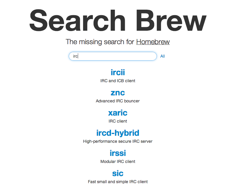 searchbrew.com The missing search for homebrew. publish eval $(docker-machine env searchbrew) cd server sbt docker:publishLocal cd ../docker-compose docker-compose up -d