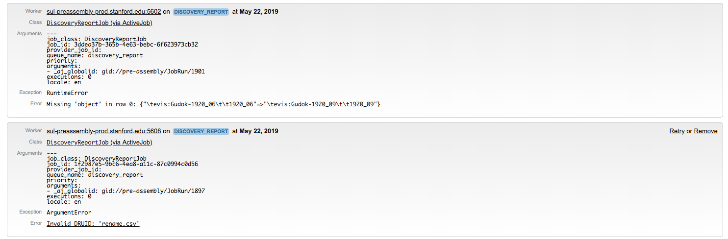 In this case, the two failed jobs were caused by a manifest that was lacking druid and object columns and by the inclusion of a filename rename.csv in the druid column of the manifest.