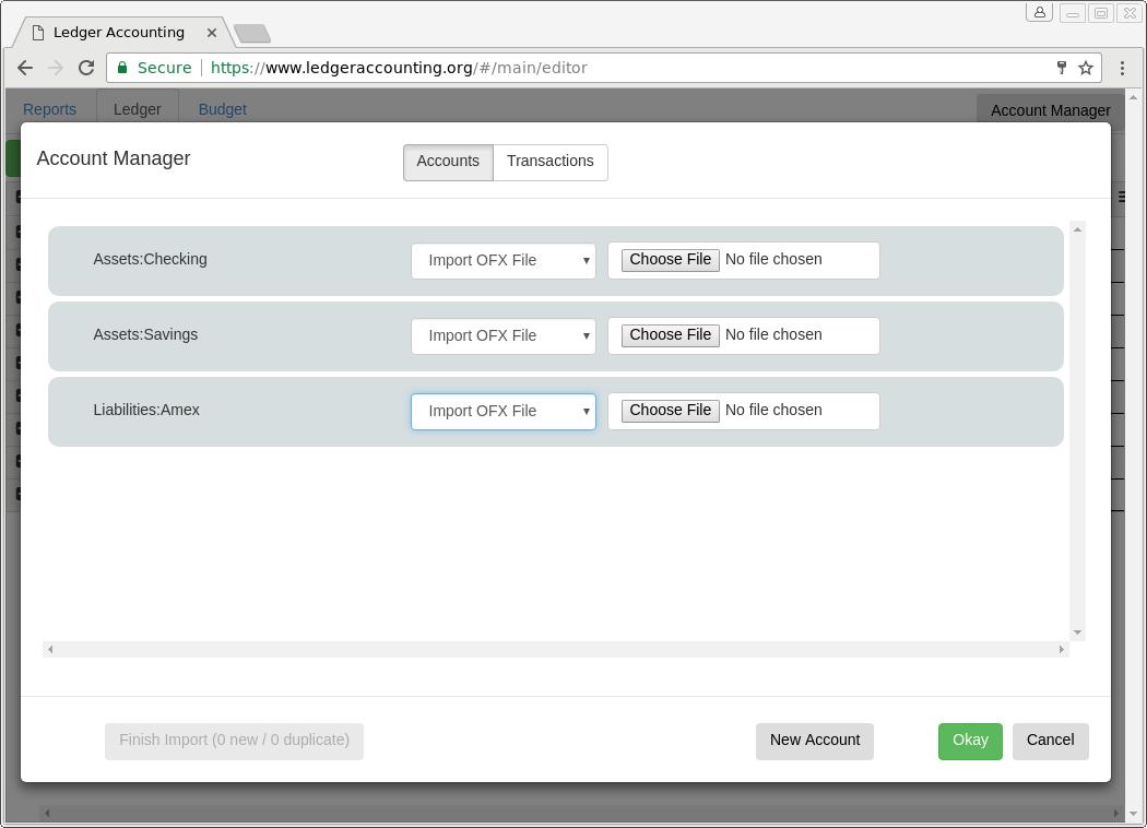 - Supports import of existing ledgers from hledger/ledger-cli/beancount users using the "Edit Text-based Ledger" button in the ledger editor, assuming the imported ledgers only consist of simple transactions with splits. It also supports comments with the ";" symbol but will not support comment blocks with the "comment" directive. The internal ledger parser does not currently support any directives such as "account", "alias", "include", or "P" (price of commodity) although it does allow @ to be included in a transaction posting amount to show the exchange of one commodity for another. It does not have any support for hledger's periodic transactions or automated postings (transaction modifiers).