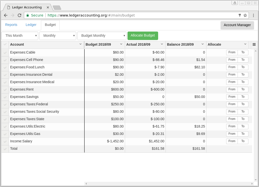 - Implements a full, personal finance budgeting system based upon zero-sum budgeting (also known as envelope budgeting). Dollar amounts may be "transferred" between envelopes using the web UI. Income automatically shows up in income "envelopes" and may then be distributed to expense "envelopes". Current balance of each envelope can be accessed from the web GUI at any time. Double-clicking on any balance column in a budget report links to a transaction-level report that shows the underlying transactions.