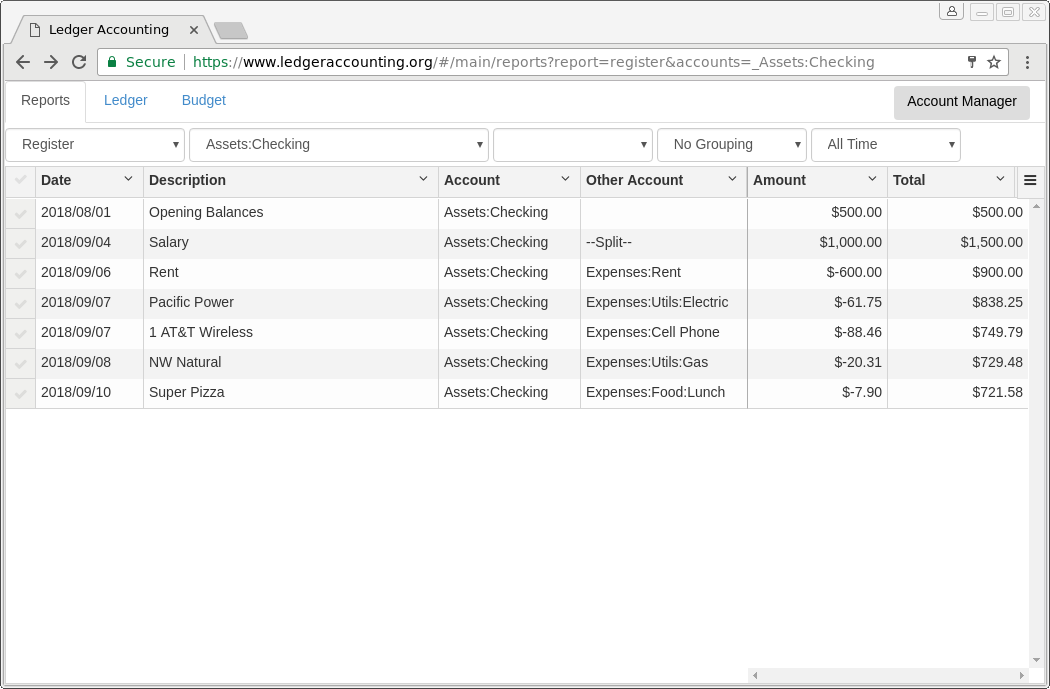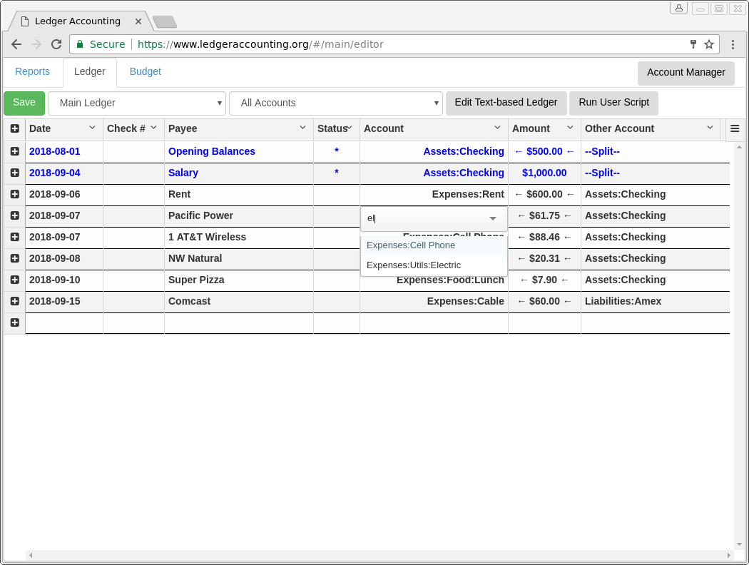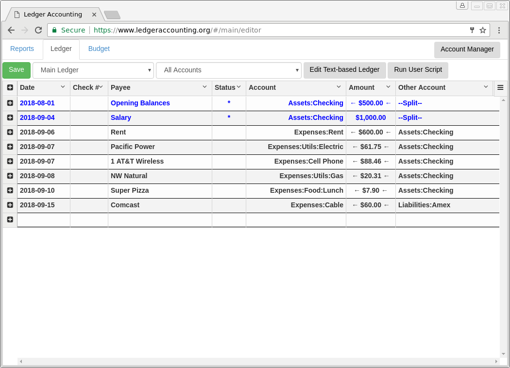 - Offers full double-entry accounting ledger functionality through a single-page web app. Transactions can have dates, check numbers, payees, memos, and transaction splits. Transaction splits can have accounts, amounts, and memos associated with them. Memos may be enabled via the button in the upper-right corner of the transaction editor grid. New transactions or transaction splits can be created by double-clicking a blank area within the editor grid.