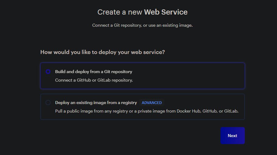 - Create a new web service in your render account and click "Build and deploy from a Git repository"