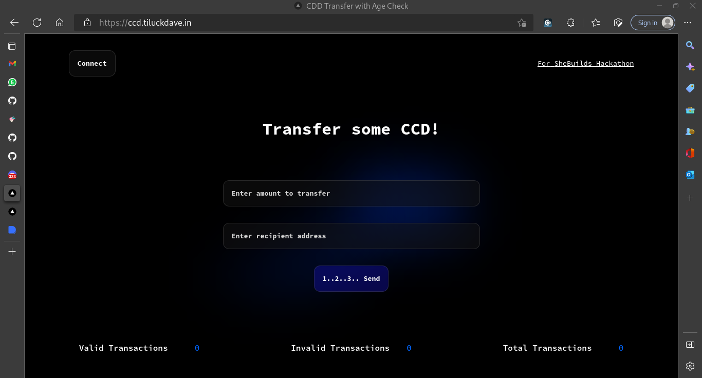 The objective of this project, developed for the SheBuilds Hackathon under the Blockchain track, is to facilitate successful ConCordium Coin (CCD) transfers using Concordium's ID layer, but only for individuals who are over the age of 18. In addition, the application updates a smart contract with counters tracking both valid and invalid transaction requests.