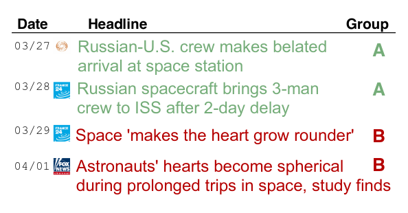 url), the headline text (headline), the publication date (date), the group annotations of 5 annotators (annot_1_group, ...annot_5_group), and an aggregate group (global_group). - The classification compatible version of HLGD containing ~20,000 headline pairs and binary labels indicating whether the headlines are in the same global group or not. The classification dataset is integrated into HuggingFace's