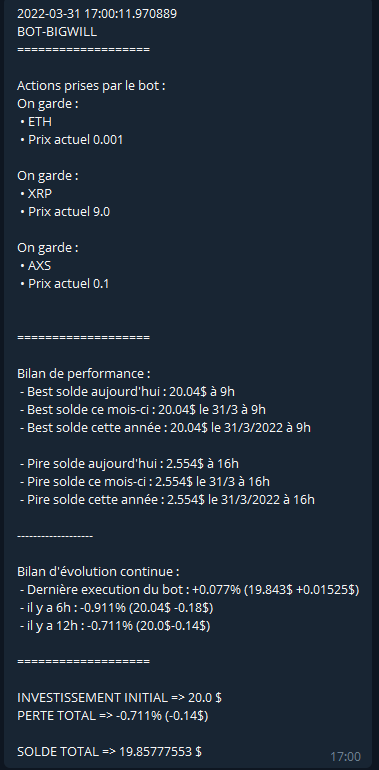 Bot-Trading-Advanced est un bot de trading qui va devoir être executé une fois par heure. Contrairement aux bots d'origine, il simplifie toutes les notifications que fera votre bot de trading.