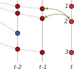 In the figure, we are at frame t and observe three particles (in light red). Up to frame (t-2) we have been tracking four particles successfully. At (t-1) we have lost one of them (in blue) and three remains. We'll name these as 1, 2 and 3. Now at