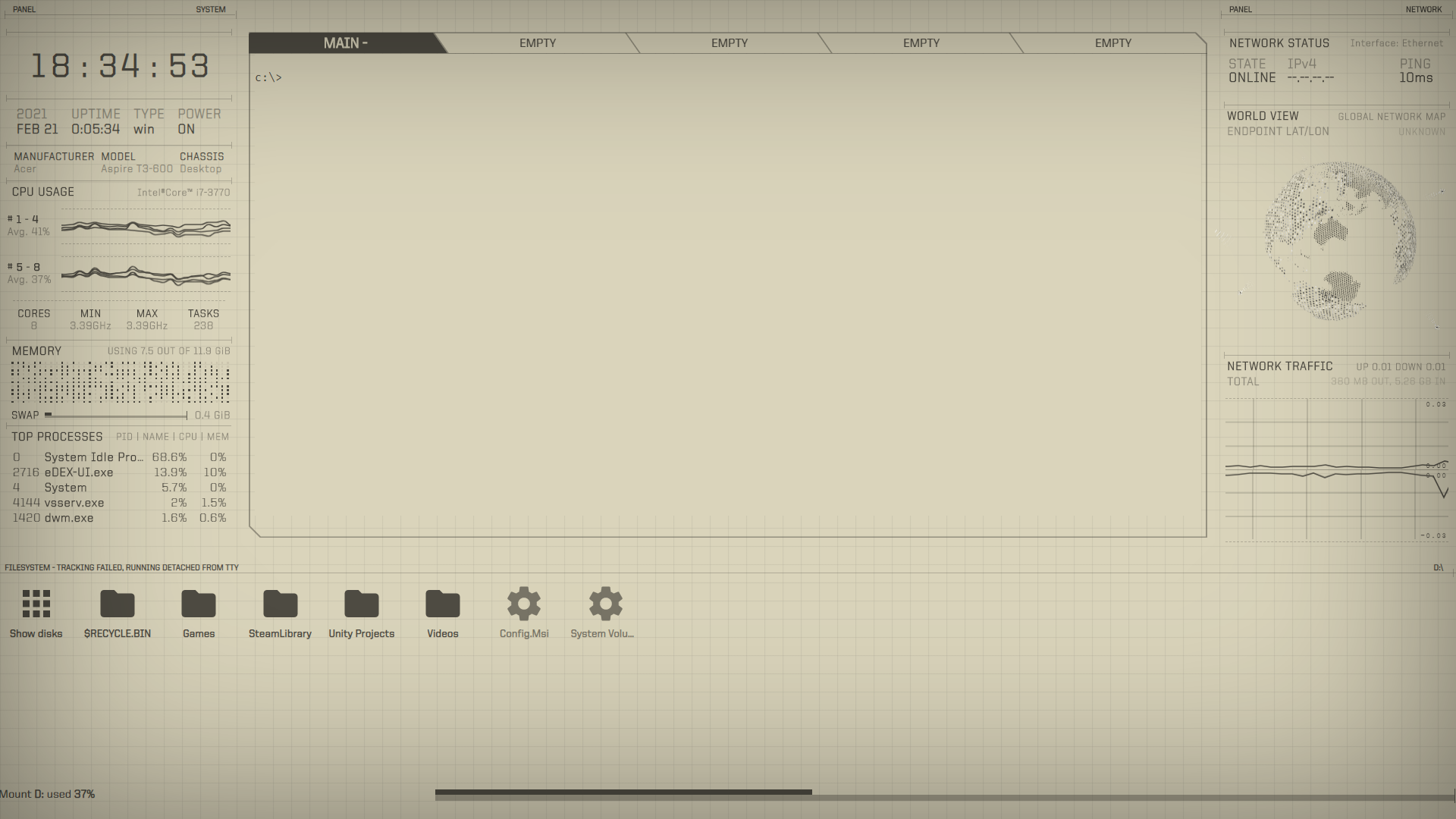 Its a pretty simple re-color theme for eDEX-UI. Added a vignette and the square grids for the background and thats pretty much it.
