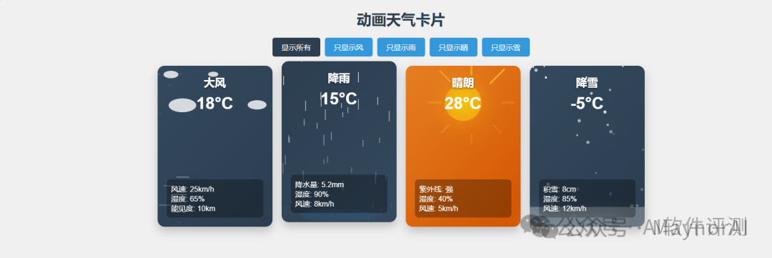 挑战: 创建一个 HTML 文件,实现带 CSS & JavaScript 动画的天气卡片。卡片需并排显示,背景为深色,具备以下动画: